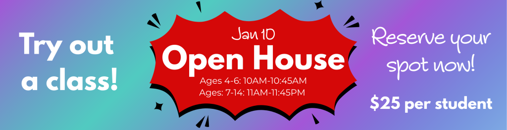 Limited spots are available! *Registration required to attend – $25 per student. Plus, if you decide to enroll in a Semester Class after the Open House, the registration fee and discount will be applied to your class. Don’t miss out on this chance to let your child shine and discover the magic of musical theater!